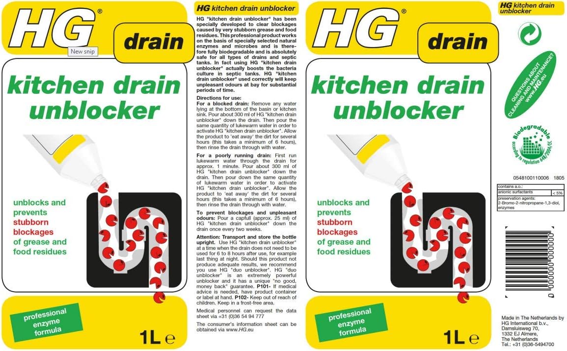 Pour a third of the drain unblocker down the drain. HG kitchen drain unblocker is based on natural micro-organisms that quite literally eat their way through the blockage and can therefore unblock any drain. Depending on the application ie.