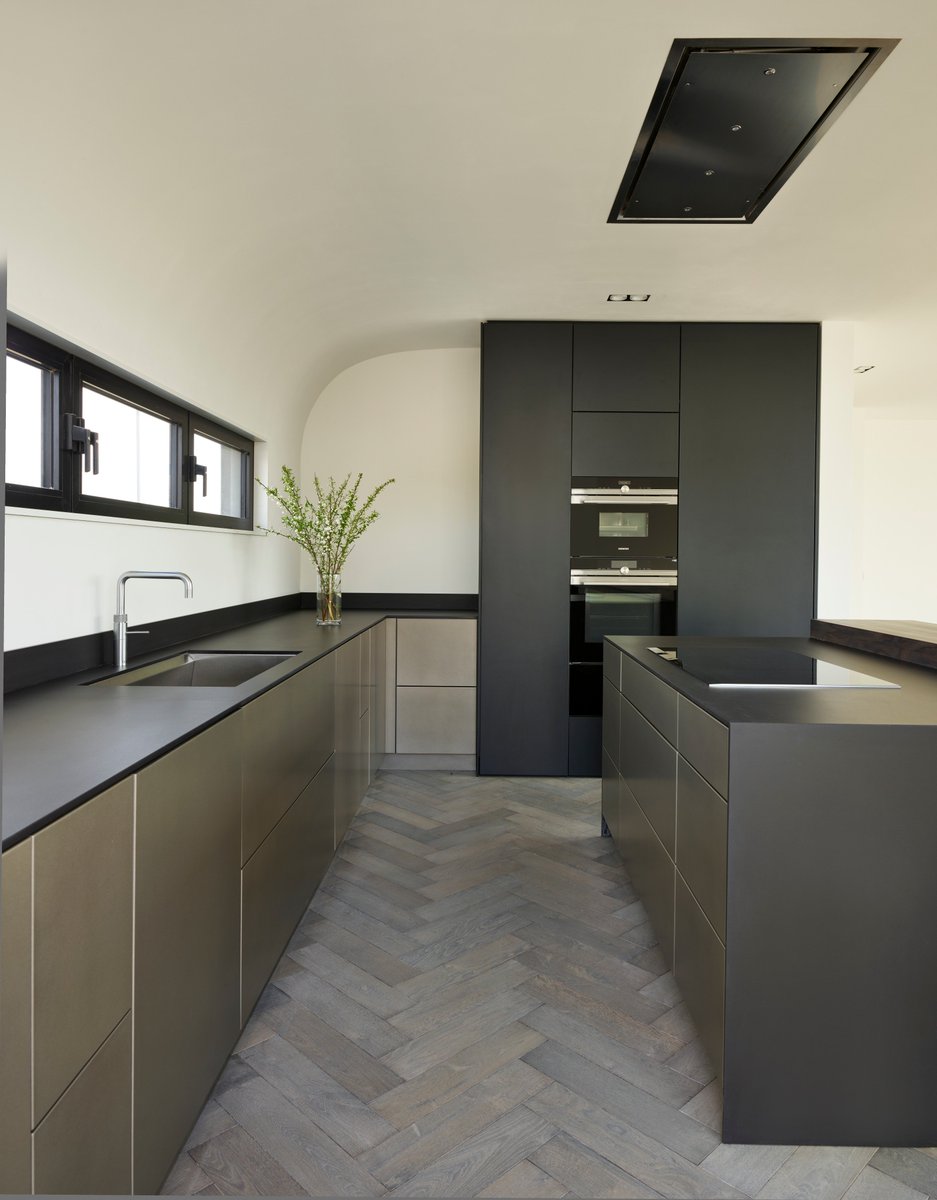 Pairings of ideas and spaces colours and shapes. Bespoke kitchen island in fumed oak and basalt Black Neolith porcelain worktop. Luxury kitchens South East London are designer bespoke kitchens thus suit to residents lifestyles.