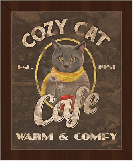 Amazon Com Cozy Cat Cafe Warm Comfy Grey Cat With Yellow Muffler And Coffee Indoor Sign For Kitchen Diner Restaurant Wall Art Print On Canvas With Espresso Frame Posters Prints